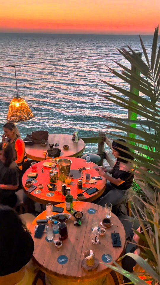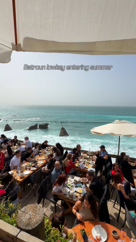 Batroun seaside restaurant on Lebanon's coast — fresh seafood, sunset beach bar; relaxed Lebanese and Gulf family crowd.